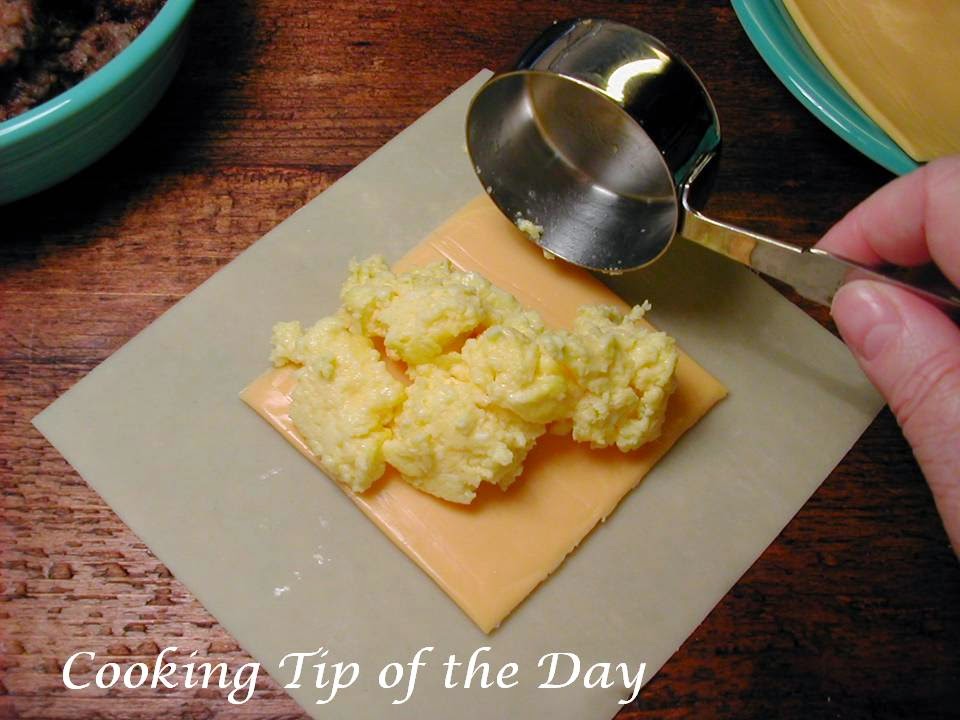On top of the cheese… in the middle place about ¼ cup scrambled eggs and some crumbled sausage.